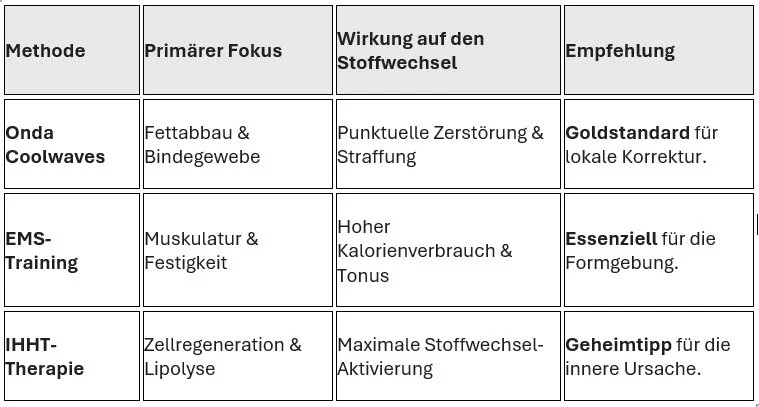Um Cellulite wirklich zu besiegen, müssen wir drei Ebenen adressieren: das Fettgewebe (Onda), die Muskulatur (EMS) und das zelluläre Kraftwerk (IHHT).